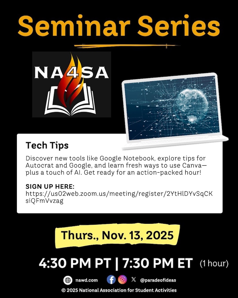 Each August, NA4SA also sponsors an annual National Activity Advisors Clinic (NAAC) which features valuable Advisor training and networking in an easily accessible virtual setting. You'll meet and work with the best of the best, bringing back ideas that you can use right away to kick off the new school year!