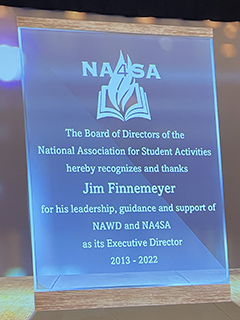 To honor the service of Jim Finnemeyer (pictured at right) who served as the second Executive Director of this organization from 2013 to 2022, this award was establised by the NA4SA Board of Directors in 2022 to recognize an outstanding individual who demonstrates exemplary service to this organization over the years, along with such exemplary service to the Student Activity Professionals for whom this organization is dedicated to - just like Jim did througohut his career as an educator, advisor, and unparalleled leader.