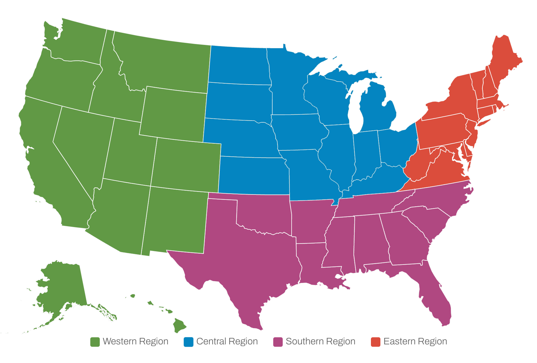 Wear your Region's designated color (we'll give you a Region color shirt!) to make finding and bonding easy with your fellow Regional attendees - see the map at right to find out which of our four Regions YOU are a part of!