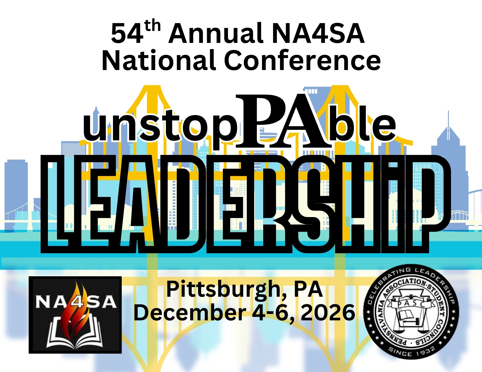 After the success of our 2025 NA4SA National Conference, "Great Lakes Leadership", the gavel has now been passed and we are looking forward to our 54th Annual NA4SA National Conference, which will be held the weekend of December 4-6, 2026 in Pittsburgh, Pennsylvania! YOU are invited to join us for "UnstopPAble Leadership", a unique conference that will bring together the Advocates, Advisors, Administrators, and Allies of Student Activities for a weekend of learning, sharing ideas and best practices, networking, and FUN!